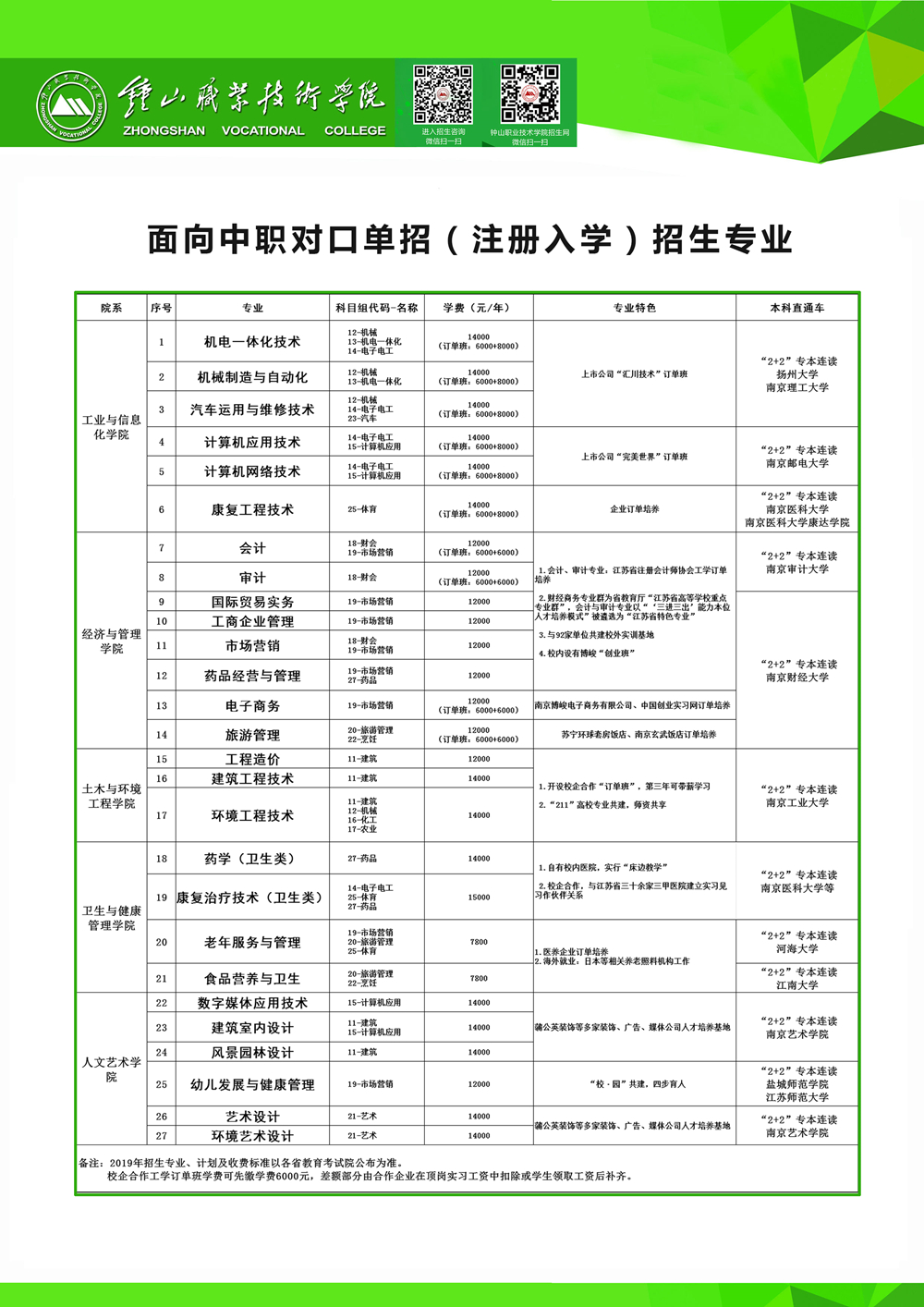 面对中职对口单招(注册入学)招生专业